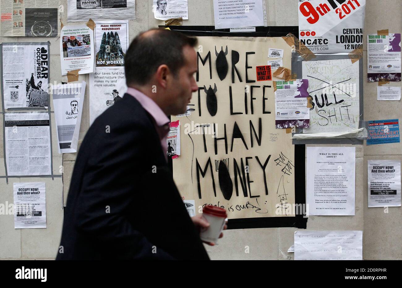 A Pedestrian Walks Past Anti Capitalist Posters Outside St Paul S Cathedral In London November 7 2011 Most London City Workers Believe There Is Too Great A Gap Between Rich And Poor In Britain